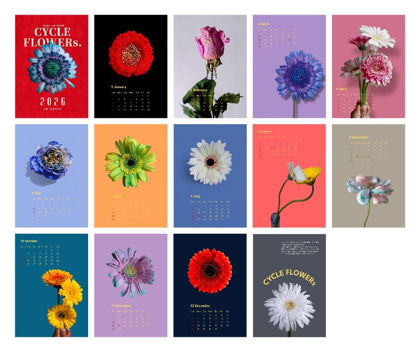 2025年に街角花屋で販売した、規格外の花の表情を収めたカレンダー。